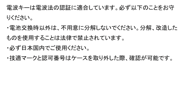 航空機に電子キーを持ち込む場合は、航空機内で電子キーのスイッチを押さないでください。また、かばんなどに保管する場合でも、簡単にスイッチが押されないように保管してください。スイッチが押されると電波が発信され、航空機の運行に支障をおよぼすおそれがあります。