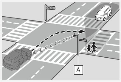 DSSS用路側装置が設置された交差点であっても、DSSS用路側装置の種類や交差点に進入する方向によっては、対向車のみを検知し、歩行者に対する注意喚起をしない場合があります。