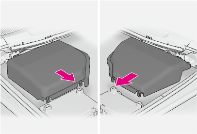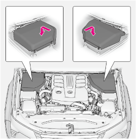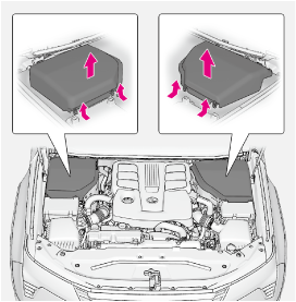 エンジンルームカバーを取りはずす前に、エンジンスイッチをOFFにしてください。熱くなった部品でやけどをしたり、作動中の部品に巻き込まれて重大な傷害を受けるおそれがあり危険です。