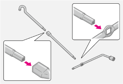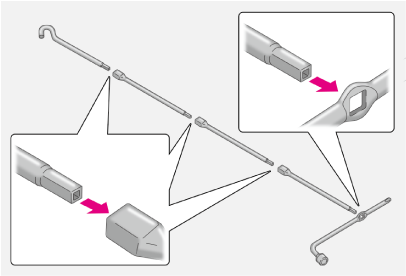 ジャッキハンドルが不意に分解しないように、ジャッキハンドルを組み付けたあと、ホイールナットレンチの穴部を使いネジ部を確実に締め付けてください。