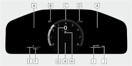 - アナログメーター走行モードや設定によって表示が切りかわります。(→ユーザーカスタマイズ機能一覧)タコメーター:毎分のエンジン回転数を示します。ハイブリッドシステムインジケーター:ハイブリッドシステムの出力や回生レベルを示します。(→ハイブリッドシステムインジケーター)