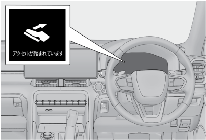 低速走行時にアクセルペダルが強く踏み込まれ、衝突の可能性があるとシステムが判断したとき、ハイブリッドシステム出力を抑制または弱いブレーキをかけることで加速を抑制します。作動時には、ブザー音が鳴り、マルチインフォメーションディスプレイに警告灯とメッセージを表示します。