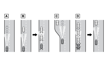 車両前方の先行車の有無・先行車との車間距離を判定して、先行車との適切な車間距離を確保する制御をします。また、車間距離切りかえスイッチを操作して、希望の車間距離に設定することもできます。