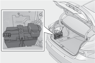 この車両の補機バッテリーはトランク(助手席側)のカバー内にあり、エンジンルームには搭載されていません。(補機バッテリーはバッテリー液の補充が必要ないタイプのため、バッテリー液量等の点検は不要です)
