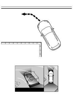 コーナリングビューモードがONになっている場合、ハンドルを直進状態から180度以上回転させると、パノラミックビュー&サイドクリアランスビューからパノラミックビュー&コーナリングビューに切りかわります。