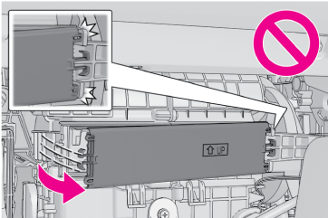 - グローブボックスがいっぱいまで開いた状態から、少しだけ持ち上げた位置で手前に引き、グローブボックス下部の結合部をはずす軽く引いても結合部がはずれない場合は、無理に引っ張らず、持ち上げる量を微調整しながら手前に引いてください。