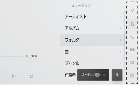 オーディオ操作画面を表示します。お好みのオーディオソースを選択して再生できます。(→オーディオのソースを変更する, ラジオを聴く)
