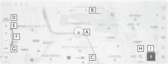 - 自車位置マーク(→車の現在地の表示)現在位置と車が向いている方角を表示します。