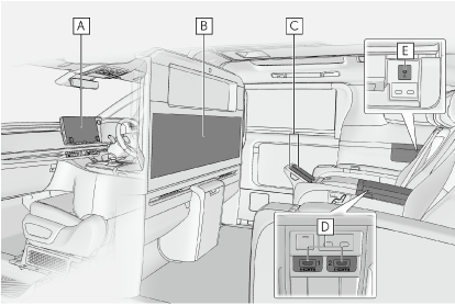 リヤシートエンターテインメントシステムは、後席で前席オーディオシステムと同じソース、または前席オーディオシステムと別のソースを視聴できます。48インチディスプレイは、画面を分割して左右でソースを選択できます。本書では、14インチディスプレイを代表に記載しています。