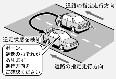 サービス対象道路にて、逆走状態を検知し、画面表示と音声で「ポーン、逆走のおそれがあります。進行方向をご確認ください」と案内します。