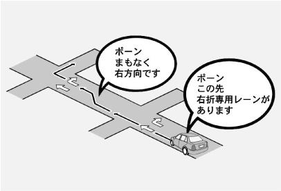 目的地案内中で、右折(左折)する交差点では右折(左折)専用レーン案内はされません。この場合は「ポーン まもなく右方向(左方向)です」と音声案内されます。