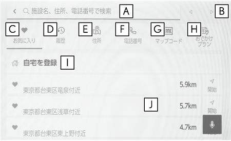 - お気に入り登録されている地点のリストを表示します。(→お気に入り地点を目的地に設定する)お気に入り地点を登録しているときのみ使用できます。