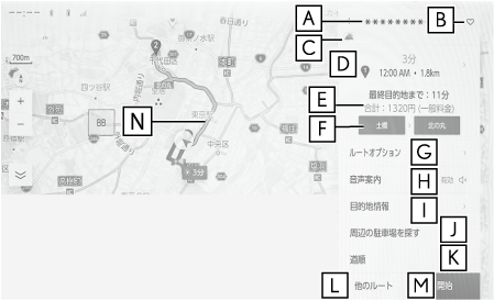- 目的地案内を開始します。長押しすると目的地案内のデモを開始します。(→目的地案内のデモを見る)