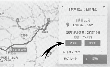 目的地を設定したあと、全ルート図表示画面に表示されている出口IC・入口ICを1カ所ずつ指定することができます。