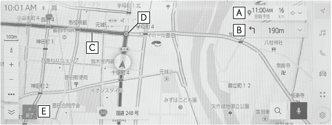 4. 目的地案内中、直近の通過および分岐する交差点に表示されます。