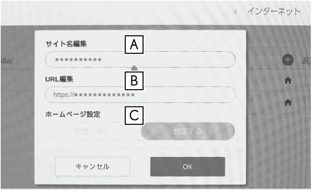 ブックマークの名称とURLの編集、ホームページへの設定をすることができます。