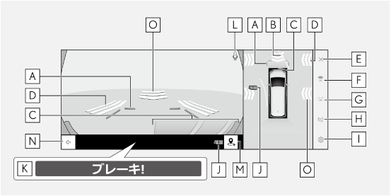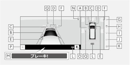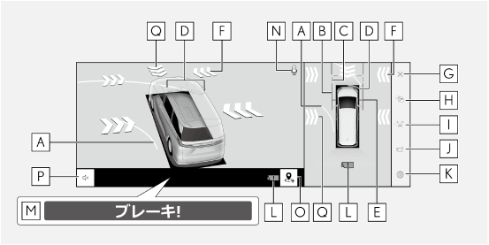 クリアランスソナーが障害物を感知したとき(シフトポジションがDまたはNのとき)に、自動で表示されます。