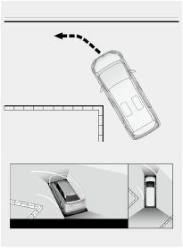 コーナリングビュー自動表示モードがONになっている場合、ハンドルを直進状態から180度以上回転させると、パノラミックビュー&サイドクリアランスビューからパノラミックビュー&コーナリングビューに切りかわります。