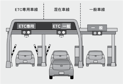 ETC料金所には、料金支払い方法に応じて、ETC専用車線、混在車線、一般車線(一般レーン)があります。ETCを利用する場合は、ETC専用車線または混在車線に進入してください。