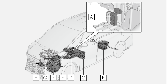 ハイブリッドシステムには、駆動用電池・パワーコントロールユニット・オレンジ色の高圧ケーブル・電気モーターなどの高電圧部位(最高約393.6V)や、冷却用ラジエーターなどの高温部位がありますので、ご注意ください。ご使用前に、ここで説明している内容をよくお読みいただき、正しく取り扱ってください。なお、高電圧部位には、取り扱い上の注意喚起のため