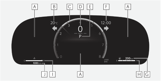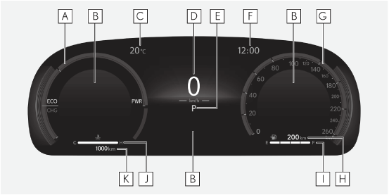- アナログメーターカスタマイズ設定から、お好みのメーターに変更することができます。(→設定を変更するには)タコメーター:毎分のエンジン回転数を示します。ハイブリッドシステムインジケーター:ハイブリッドシステムの出力や回生レベルを示します。(→ハイブリッドシステムインジケーター)