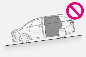 この場合、傾斜した場所では、スライドドアが急に開いたり閉じたりするおそれがあるので、十分注意してください。