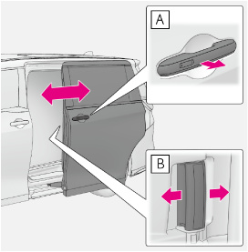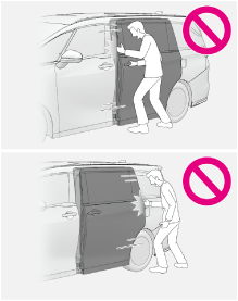 スライドドアを開閉する前に、運転者はスライドドアが安全に開閉できるように車外および車内のスライドドア付近の状態を必ず確認してください。