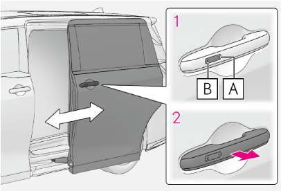 閉めるドアが施錠されているとき:電子キーを携帯してスイッチを押すと、すべてのドアが解錠され、スライドドアが自動で開きます。電子キーが検知エリア内(→作動範囲(電子キーの検知エリア))にある状態で、スイッチを押してください。ドアが解錠されているとき:電子キーを携帯していなくても、スイッチを押すとスライドドアが自動で開閉します。 - ドアハンドルを引いて開閉するスライドドアを解錠してから操作してください。