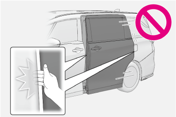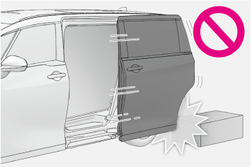スライドドアを開けるときは縁石や壁などにあたらないように注意してください。スライドドアを損傷するおそれがあります。