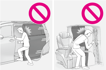 パワースライドドア作動中に乗り降りしないでください。