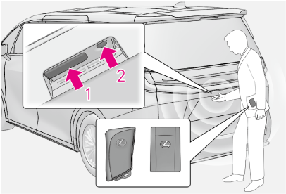 バックドア施錠時:電子キーを携帯して、バックドアオープンスイッチを押し続ける