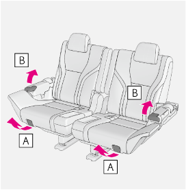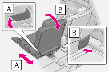 アームレスト手前に倒して使用する知識バックドア側からサードシートを調整するには前後位置調整レバーを引いたまま、シートを前後に動かします。リクライニング調整レバーを引いたまま、背もたれを前後に動かします。警告シート調整について背もたれは必要以上に倒さないでください。必要以上に倒しすぎると、事故のときに体がシートベルトの下にもぐり、腹部などに強い圧迫を受けたり肩部ベルトが首にかかるなどして、重大な傷害におよぶか、最悪の場合死亡につながるおそれがあります。シート調整後はシートを軽くゆさぶり、シートが確実に固定されていることを確認してください。注意アームレストの破損を防ぐために過度の負荷をかけないでください。