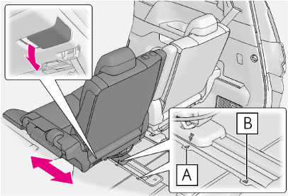 サードシートの格納時は、持ち上げたシートの前後位置を動かさないでください。持ち上げた状態からシートの位置がかわると、もとにもどす際にシートが破損するおそれがあります。