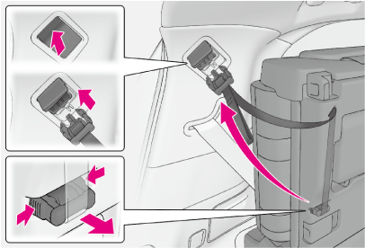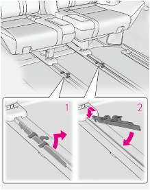 シート固定ベルトの上下のツメを押してはずし、シートクッション裏側に格納します。
