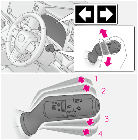 - 右側へ車線変更(レバーを途中まで動かして離す)右側方向指示灯が5 回点滅します。