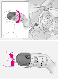 ウォッシャー液を出すレバーを前方へ押すとワイパーと連動してウォッシャーが作動します。カメラ洗浄システムも連動して作動します。※:カメラ洗浄システムについては、別冊「マルチメディア取扱説明書」を参照してください。