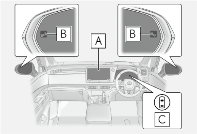 - 運転支援情報表示灯ブラインドスポットモニターがOFFのときに点灯し、マルチインフォメーションディスプレイにメッセージが表示されます。
