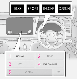 - カスタムモードパワートレーン制御・ステアリング制御・サスペンション制御・ブレーキ・エアコン作動の機能をお好みで設定し、走行することができます。(→ユーザーカスタマイズ機能一覧)カスタムモード表示灯が点灯します。