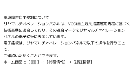 リヤマルチオペレーションパネルは、電波法に基づく特定無線設備の技術基準適合証明等に関する規則を順守しており、その証として「技適マーク」がリヤマルチオペレーションパネルの電子銘板に表示されております。