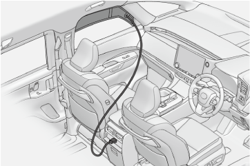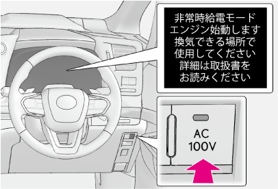 災害などによる非常時に電力が必要なとき、車両の走行機能を停止した状態で、AC100Vで消費電力の合計が1500W 以下の電気製品を使用することができるシステムです。(→非常時給電システムを使用するには)