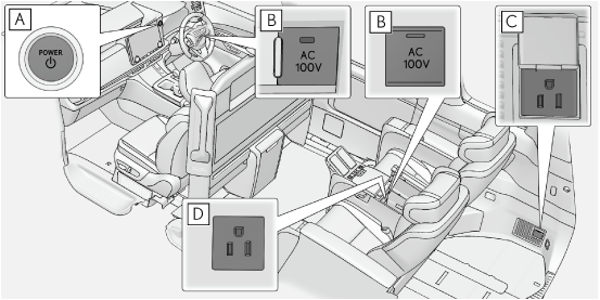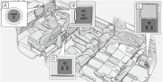車内において、AC100Vで消費電力の合計が1500W の電気製品を使用することができるシステムです。(→アクセサリーコンセントを使用するには)