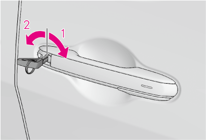 電子キーと車両間の通信がさまたげられたり(→機能が正常に働かないおそれのある状況)、電子キーの電池が切れたときは、スマートエントリー&スタートシステムとワイヤレスリモコンが使用できなくなります。このような場合、次の手順でドアを開けたり、ハイブリッドシステムを始動したりすることができます。
