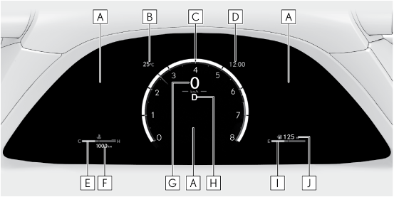 シフトポジションや走行モード、設定などに応じて、メーターの表示や一部の計器類の配置が切りかわります。設定はセンターディスプレイで変更することはできます。(→ユーザーカスタマイズ機能一覧)