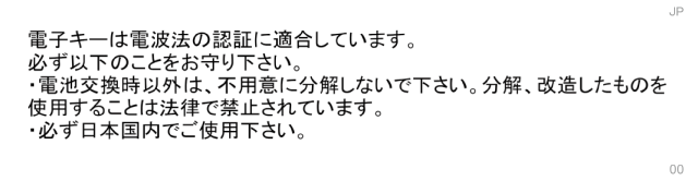 航空機に電子キーを持ち込む場合は、航空機内で電子キーのスイッチを押さないでください。また、かばんなどに保管する場合でも、簡単にスイッチが押されないように保管してください。スイッチが押されると電波が発信され、航空機の運行に支障をおよぼすおそれがあります。