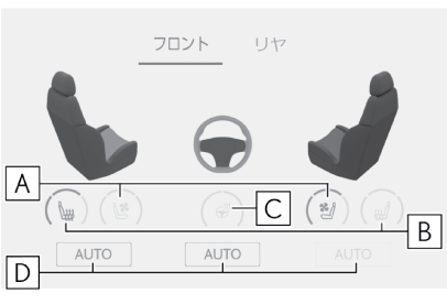 HOME画面で“エアコン”をタッチすると、エアコン操作画面が表示され、リヤシートヒーター/リヤシートベンチレーターを操作できます。(→リヤマルチオペレーションパネル)