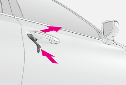 電子キーと車両間の通信がさまたげられたり(→機能が正常に働かないおそれのある状況)、電子キーの電池が切れたときは、スマートエントリー&スタートシステムとワイヤレスリモコンが使用できなくなります。このような場合、次の手順でドアやトランクを開けたり、エンジンを始動したりすることができます。