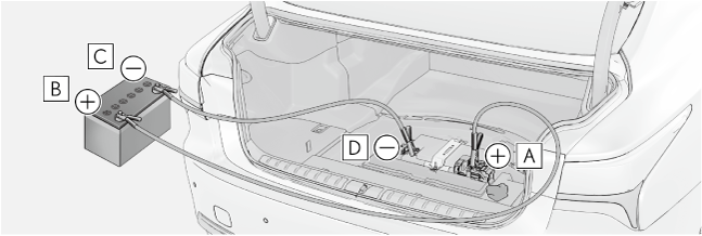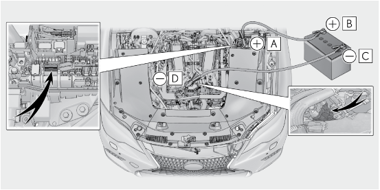 - 電子キーを携帯していることを確認するブースターケーブル接続時、場合によっては、オートアラームが作動し自動的にドアが施錠されます。(→オートアラーム作動によるドアロック機能)