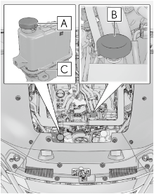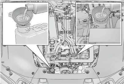 • エンジンおよびラジエーターが熱い場合は、エンジンカバー内側の冷却水注入口のキャップや冷却水リザーバータンクのキャップまたはインタークーラーリザーバータンクのキャップを開けないでください。