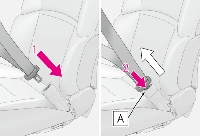• プレートがバックルに確実に挿し込まれているか、シートベルトがねじれていないかを確認してください。うまく挿し込めない場合はただちにレクサス販売店に連絡してください。