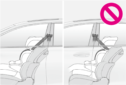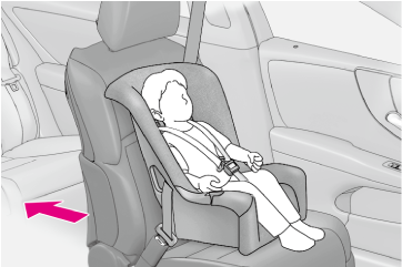 チャイルドシートの隣の席を使用するときは、肩部ベルトが確実に肩を通り、腰部ベルトが腰骨のできるだけ低い位置に密着することを確認してください。チャイルドシートの隣の席に座ったときに、チャイルドシートの種類によっては、乗員の体またはシートベルトがチャイルドシートと干渉するためシートベルトが正しく着用できず、十分な効果を発揮できない場合があります。その場合は、他の席を使用してください。